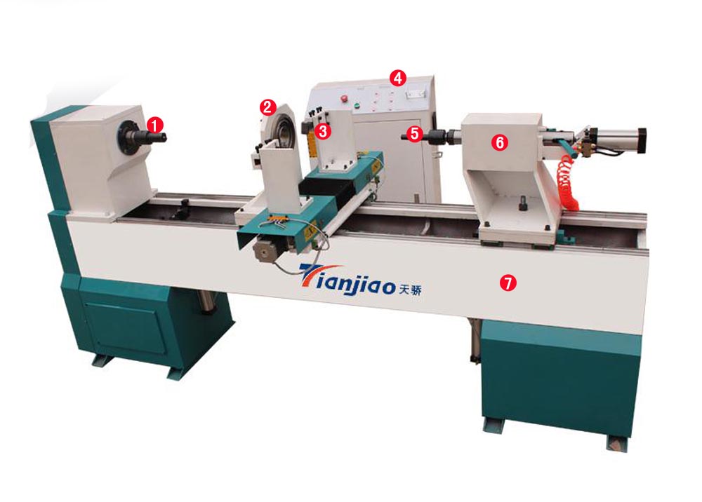 圖中標(biāo)注1 和 5的部分都是起固定作用的,一個是夾頭,一個是頂針。其中2是輔助1和5的,主要是防止木料在加工過程中飛出,起安全保護(hù)作用。4為電氣控制箱,主要放置電器配件。